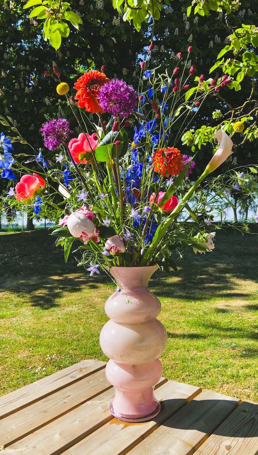 Laat je verrassen door dit kleurrijke, speels gebonden boeket vol zomerse energie. Een weelderige combinatie van seizoensbloemen in levendige tinten zoals knalroze, blauw, oranje, paars en aubergine. Denk aan Delphinium, Pioenrozen, Dahlia's en speelse grassen - elk met hun eigen vorm en structuur, samengebracht tot een boeket dat vrolijkheid en elegantie uitstraalt.