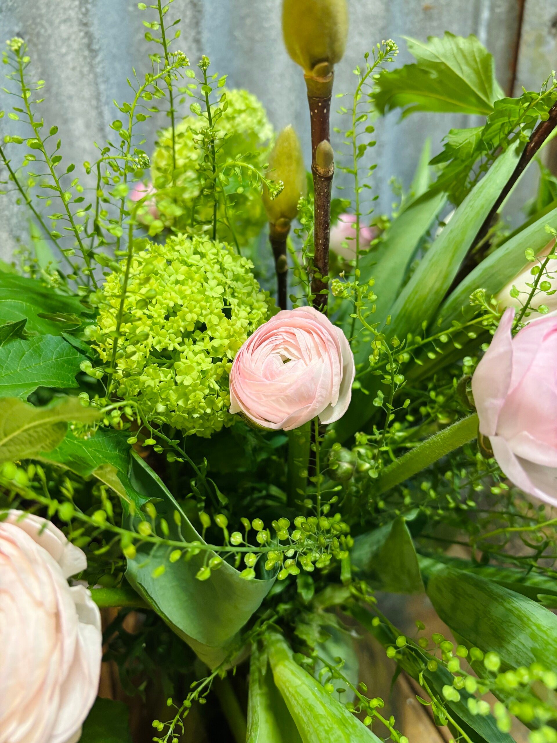 Dit prachtige boeket in licht roze met fris groene tinten zorgt gegarandeerd voor een heerlijk voorjaarsgevoel. Dit boeket gevuld met onder andere tulpen, ranonkels en viburnum brengt sfeer en puur lente in huis. Perfect voor de echte voorjaars liefhebbers. Verkrijgbaar in twee verschillende formaten!