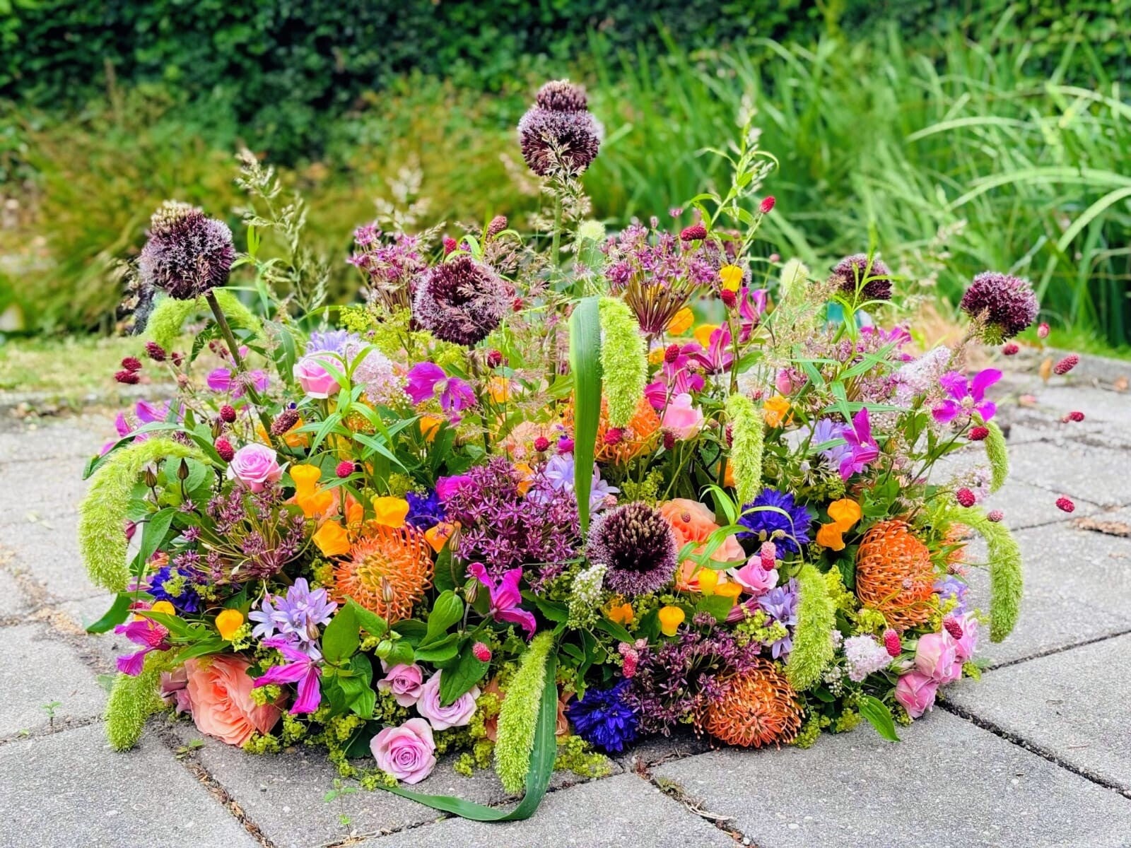Dit bloemstuk verwonderd je, je blijft er naar kijken. Steeds zie je weer iets nieuws. Net zoals in een prachtige veldtuin. Verkrijgbaar in verschillende vormen, zoals een biedermeier, ovaal of langwerpig.