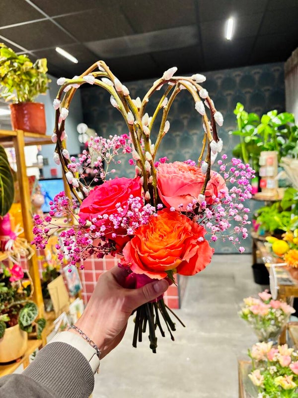 Een speels en liefdevol bloemarrangement met een handgevormd hart van zachte katjes. In het hart stralen warme tinten van perzik, roze en knalroze samen met fijne bloemetjes voor een frisse, vrolijke uitstraling. Afgebonden met felroze lint voor net dat extra beetje liefde!