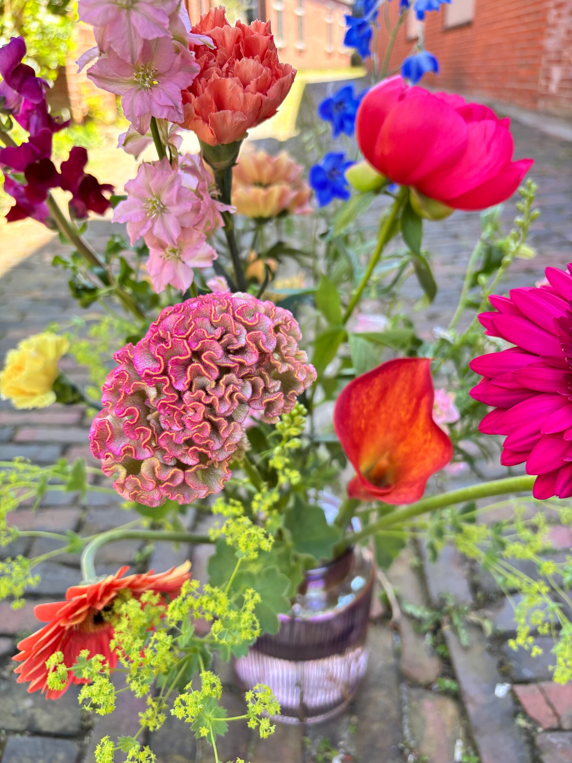 Met het frisgroene van de vrouwenmantel gemixt met prachtige frisgekleurde bloemen zoals de Ridderspoor en Pioenroos zorg je er voor dat je een goede indruk achter laat!